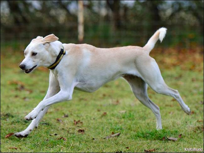 Der Rüde "Kalokairi", sein Name bedeutet "Sommer", wurde im November 2010 in Sitia/Kreta geboren und kam im Alter von ca. 10 Monaten zu uns. Tierschützer auf Kreta hatten ihn nach einer schweren Verletzung gesund gepflegt. Eigentlich wollten wir nur Pflegestelle für Kalli sein, aber er fügte sich so gut in unser bestehendes Rudel ein und bezauberte uns mit seinem Charme, also blieb er bei uns. Er hat Agility ohne Turnierambitionen und Tricktraining gemacht. Höchste Motivation zeigte er beim Mantrailing, war als Sporttrailer Weiß B geprüft. Im April 2017 haben wir Kalokairi auf der Windhund-Zuchtschau auf Gut Basthorst zur Phänotypbestimmung den Richtern des Deutschen Windhundzucht- und Rennverbandes DWZRV (VDH) vorgestellt. So wurde er als erster Hund der Rasse Kritikos Lagonikos in das Register-Zuchbuch des DWZRV eingetragen, unter der Zuchtbuchnummer KL Reg.0-0001 . Leider ist unser Kalli am 17. Oktober 2025 von uns gegangen, in seinem 16. Lebensjahr...